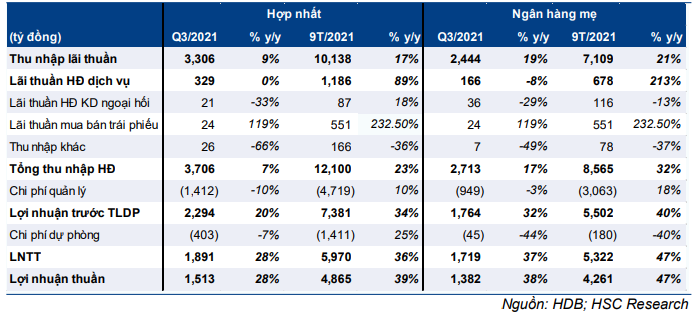Bảng 1: KQKD Q3/2021 và 9T/2021 của HDB