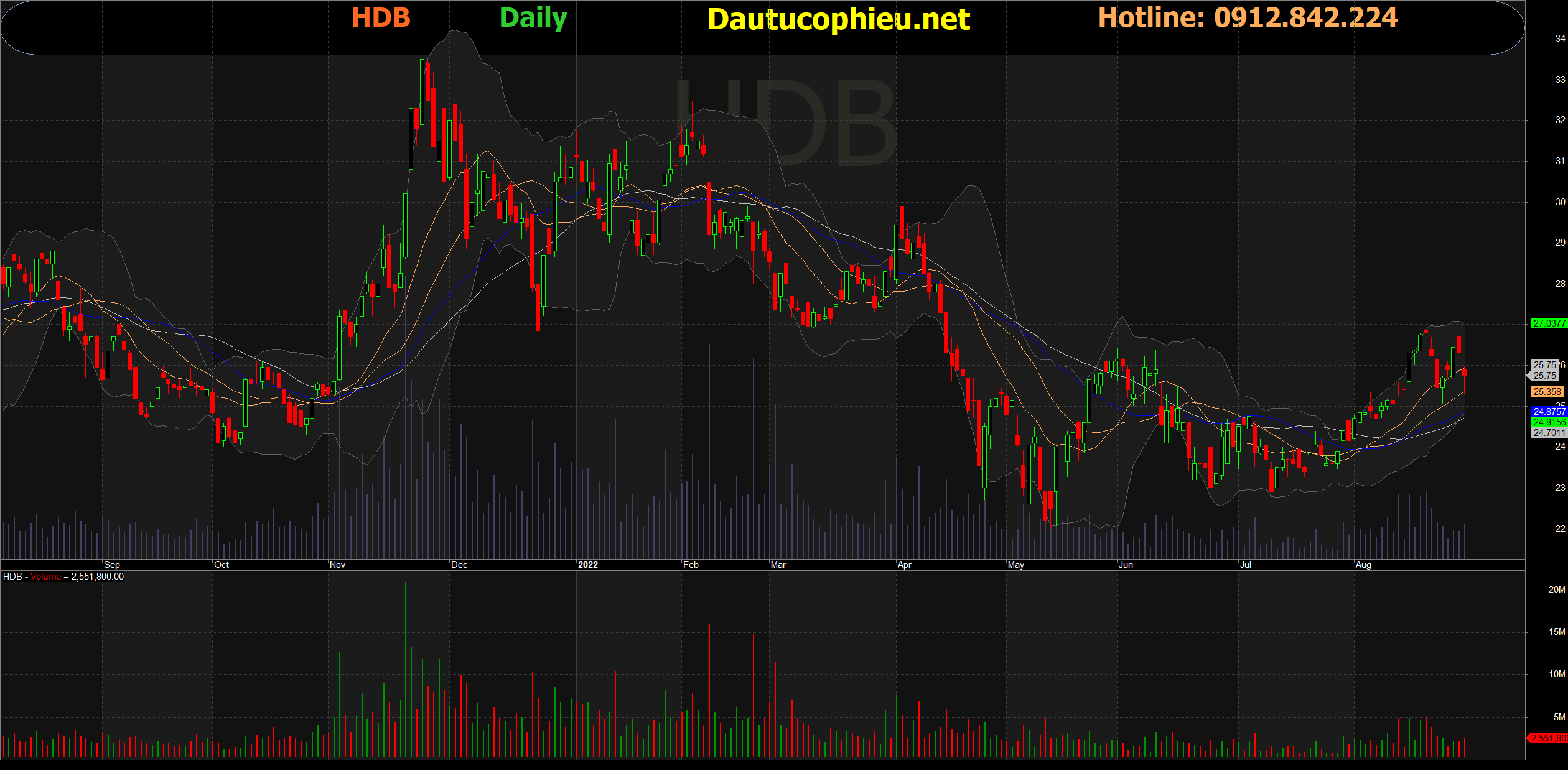 Đồ thị cổ phiếu HDB phiên giao dịch ngày 30/08/2022. Nguồn: AmiBroker