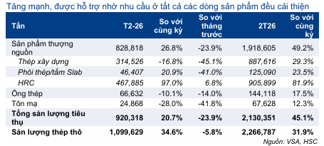 Ngày 31/3/2026, Hiệp hội Thép Việt Nam (VSA) công bố báo cáo 2 tháng đầu năm. Theo đó, HPG đã bán 2,13 triệu tấn thép thành phẩm, tăng 45,1% so với cùng kỳ, nhờ nhu cầu cải thiện ở tất cả các phân khúc sản phẩm, với động lực tăng trưởng chính đến từ HRC và thép xây dựng. Chi tiết như sau: