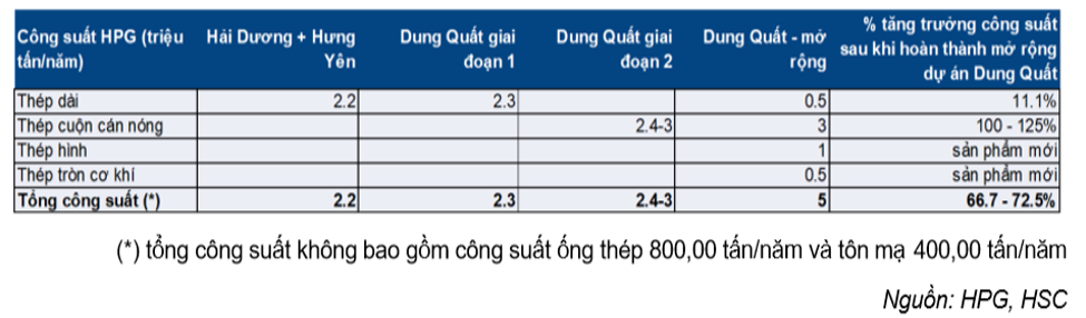 Theo HPG, Công ty dự kiến nâng công suất thêm tổng cộng 5 triệu tấn (tăng 66,7-72,5% so với công suất hiện tại) với nhiều sản phẩm: HRC, thép hình, thép cuộn và thép tròn cơ khí.