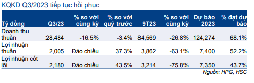 Tính chung 9 tháng đầu năm 2023, lợi nhuận thuần của HPG đạt 3,83 nghìn tỷ đồng (giảm 63,3% so với cùng kỳ), bằng 52% dự báo lợi nhuận thuần cả năm 2023 của chúng tôi là 7,4 nghìn tỷ đồng (giảm 12,8% so với năm 2022). Lợi nhuận HĐKD cốt lõi 9 tháng đầu năm 2023 đạt 3.214 tỷ đồng (giảm 75,8% so với năm 2022).