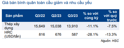 - Sản lượng tiêu thụ Q3/2023 đạt 1,94 triệu tấn thép (tăng 7,7% so với quý trước nhưng giảm 2,2% so với cùng kỳ).