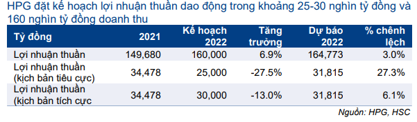 HPG trình kế hoạch doanh thu thuần năm 2022 đạt 160 nghìn tỷ đồng (tăng trưởng 6,9%). Tuy nhiên, trước những khả năng biến động của giá nguyên liệu đầu vào, bao gồm than cốc, quặng sắt và sắt phế liệu, HPG đặt kế hoạch lợi nhuận dao động trong khoảng 25-30 nghìn tỷ đồng (giảm 27,5-13%).