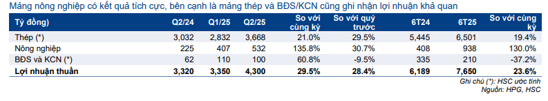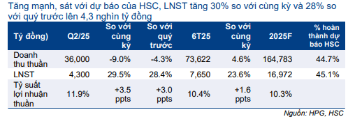 Ngày 16/7/2025, HPG công bố KQKD sơ bộ Q2/2025, cho thấy lợi nhuận thuần đạt 4.300 tỷ đồng (tăng 30% so với cùng kỳ và tăng 28% so với quý trước), sát với dự báo của HSC ở mức 4.350 tỷ đồng. Chi tiết như sau: