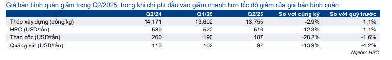 Mặc dù giá bán bình quân thấp trong Q2/2025 như đã thảo luận ở phần trên, chi phí đầu vào thậm chí giảm mạnh hơn. Ví dụ, giá than cốc giảm 28,2% so với cùng kỳ và giảm 1,6% so với quý trước, đạt bình quân 187 USD/tấn.