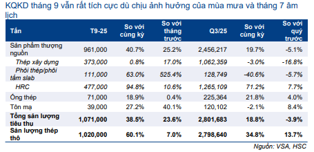 HPG đã bán 373.000 tấn thép xây dựng trong tháng 9, nâng tổng sản lượng tiêu thụ trong Q3/2025 lên 1.062.359 tấn, giảm 3% so với cùng kỳ và giảm 17% so với quý trước, do xuất khẩu sụt giảm. Trong Q3/2025: