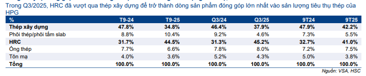 Trong tháng 9, HPG đã bán 477.000 tấn HRC, tăng 95% so với cùng kỳ và tăng 11% so với tháng trước, tiếp tục trở thành phân khúc sản phẩm có mức đóng góp lớn nhất vào sản lượng tiêu thụ thép của HPG (ở mức 45%), cao hơn mức đóng góp của thép xây dựng (ở mức 35%) trong hai tháng liên tiếp. Trong Q3/2025, sản lượng tiêu thụ HRC tăng mạnh 71% so với cùng kỳ và tăng 8% so với quý trước, đạt 1.265.109 tấn, nhờ tác động tích cực của việc áp dụng các chính sách bảo hộ. Đây là quý có sản lượng tiêu thụ HRC cao nhất, nâng tổng sản lượng tiêu thụ HRC 9 tháng đầu năm 2025 lên 3.433.242 tấn, tăng 51,3% so với cùng kỳ.
