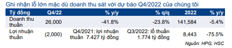 Do đó, lỗ thuần Q4/2022 tăng lên gần 2.000 tỷ đồng, so với lỗ 1.774 tỷ đồng trong Q3/2022 và lớn hơn nhiều so với dự báo của chúng tôi là lỗ 600 tỷ đồng.