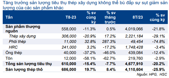 Trong tháng 8/2023, sản lượng tiêu thụ thép xây dựng của HPG đạt 306.000 tấn, tăng 17,2% so với tháng trước (nhưng vẫn giảm 20,9% so với cùng kỳ) do đơn đặt hàng xuất khẩu cải thiện. Đây là mức sản lượng tiêu thụ cao nhất kể từ đầu năm. Theo HPG: