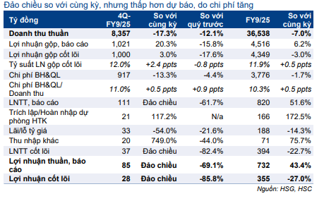 Lợi nhuận thuần Q4/NĐTC 2024-2025 của HSG thấp hơn kỳ vọng của HSC ở mức 104 tỷ đồng, chủ yếu do chi phí quản lý và thuế TNDN cao hơn dự kiến, nhưng bắt đầu có lãi trở lại (so với cùng kỳ). Quan trọng là, nếu loại trừ các khoản mục không thường xuyên, lợi nhuận thuần từ HĐKD cốt lõi sẽ đạt 28 tỷ đồng, cải thiện đáng kể so với lỗ 135 tỷ đồng trong Q4/NĐTC 2023-2024 nhưng vẫn thấp hơn 86% so với quý trước.