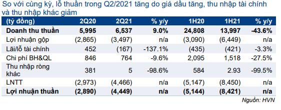 So với cùng kỳ, lỗ thuần trong Q2/2021 tăng so với mức lỗ 2.899 tỷ đồng trong Q2/2020 do giá dầu tăng, lãi từ chênh lệch tỷ giá giảm và doanh thu bán tài sản giảm mặc dù doanh thu thuần tăng nhẹ 9,0% so với cùng kỳ.