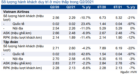 - Số lượng hành khách của công ty mẹ Vietnam Airlines (VNA) trong Q2/2021 đạt 2,28 triệu lượt, giảm 10,4% so với cùng kỳ. Trong đó, lượng hành khách nội địa là 2,26 triệu khách (giảm 10,9% so với cùng kỳ) trong khi lượng hành khách quốc tế không đáng kể, chỉ 0,02 triệu lượt (tăng 23,4% so với cùng kỳ).