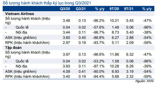 Trong giai đoạn phong tỏa nghiêm ngặt trong Q3/2021, lưu lượng hàng không giảm xuống mức thấp kỷ lục. Tổng số lượng hành khách của HVN trong Q3/2021 giảm mạnh xuống 0,13 triệu hành khách (giảm 96% so với cùng kỳ) (Bảng 1).