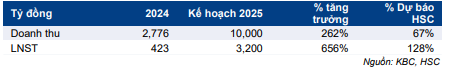 KBC đặt mục tiêu doanh thu 10 nghìn tỷ đồng, tăng trưởng 262% và cao hơn 67% so với dự báo của chúng tôi ở mức 6 nghìn tỷ đồng. Về LNST, KBC kỳ vọng đạt 3,2 nghìn tỷ đồng, tăng trưởng mạnh 656% so với năm 2024, cao hơn 128% so với dự báo của chúng tôi ở mức 1,4 nghìn tỷ đồng. Mặc dù BLĐ rất lạc quan về mục tiêu kinh doanh đã đề ra, HSC cho rằng để đạt được mục tiêu này, Công ty sẽ phải vượt qua nhiều thách thức, đặc biệt khi không có doanh thu bán đất đáng kể nào trong Q2/2025 và vẫn còn rủi ro liên quan đến thuế quan.