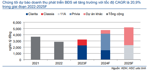 Do doanh số bán nhà giảm trong năm 2022, chúng tôi hạ 21,7% dự báo lợi nhuận thuần trong năm 2023 xuống 1,1 nghìn tỷ đồng, đi ngang so với cùng kỳ, với doanh thu đạt 3,3 nghìn tỷ đồng, tăng trưởng 11%. Lợi nhuận trong năm 2023 sẽ được thúc đẩy chủ yếu nhờ hạch toán các sản phẩm còn lại tại dự án Classia và doanh thu mới tại dự án Clarita.