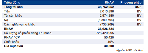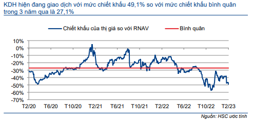 HSC hạ 4,4% giá mục tiêu theo phương pháp SoTP xuống 30.300đ. Trong khi đó, chúng tôi nâng 13,5% RNAV/cp (sau khi điều chỉnh phương pháp định giá dự án Đoàn Nguyên từ giá trị sổ sách sang DCF) và nâng mức chiết khấu đối với RNAV lên 40% (từ 30%) trong bối cảnh thị trường BĐS gặp nhiều thách thức hơn. Sau khi giá cổ phiếu tăng mạnh gần đây, KDH đang giao dịch với mức chiết khấu 49,1% so với RNAV mới, lớn hơn so với mức chiết khấu bình quân trong 3 năm qua là 27,1%. HSC hạ khuyến nghị xuống Tăng tỷ trọng.