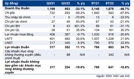 KDH công bố KQKD Q3/2022 với doanh thu là 805,5 tỷ đồng (giảm 32,8% so với cùng kỳ) và lợi nhuận thuần đạt 351,6 tỷ đồng (tăng 11,1% so với cùng kỳ). Lợi nhuận vượt dự báo của chúng tôi do số lượng sản phẩm bàn giao vượt kỳ vọng nhưng chủ yếu do thời điểm hạch toán. Lợi nhuận thuần và doanh thu thuần 9 tháng đầu năm 2022 đạt lần lượt 70% và 63,3% dự báo cả năm 2022 của chúng tôi.