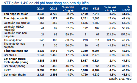 LPB công bố KQKD Q2/2025 với LNTT đạt 2.988 tỷ đồng, giảm 1,4% so với cùng kỳ, quý giảm đầu tiên sau chuỗi tăng trưởng kéo dài do sức ép từ việc chi phí hoạt động tăng trở lại mức bình thường trong khi tổng thu nhập hoạt động vẫn kém tích cực do tỷ lệ NIM thấp. Chi phí hoạt động tăng lên chủ yếu do chi phí nhân sự tăng, như đã phân tích trong báo cáo trước đó. Trong 6 tháng đầu năm 2025, tổng LNTT đạt 6.164 tỷ đồng, tăng 4,1% so với cùng kỳ, nhìn chung sát với dự báo của chúng tôi.