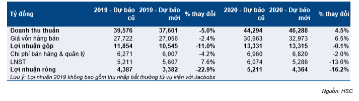 Chúng tôi đã điều chỉnh giảm dự báo lợi nhuận cho năm 2019 và 2020. Tuy nhiên, chúng tôi chưa đưa ảnh hưởng từ thương vụ sáp nhập VCM vào dự báo do chưa có thông tin cụ thể.