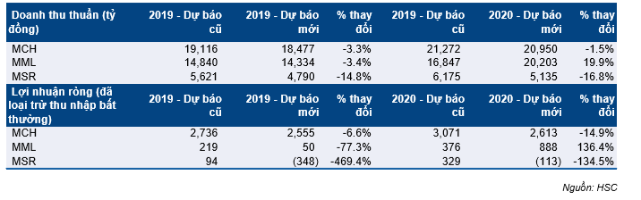 Chúng tôi điều chỉnh giảm 1,5% dự báo doanh thu thuần của MCH xuống còn 19.972 tỷ đồng, tăng trưởng 13,4% và điều chỉnh giảm 14,9% dự báo lợi nhuận thuần xuống còn 2.612 tỷ đồng, tăng trưởng 2,3%. Mảng đồ uống vẫn là động lực tăng trưởng chính của MCH và chúng tôi giả định sẽ có đóng góp từ NET (HSX) trong năm 2020 sau khi MCH hoàn thành việc mua tối đa 60% cổ phần công ty này vào Q1/2020.