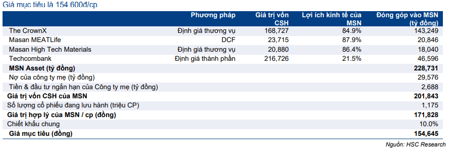 - Sau khi áp dụng mức chiết khấu tập đoàn 10%, HSC tính ra giá mục tiêu cho MSN là 154.645đ.