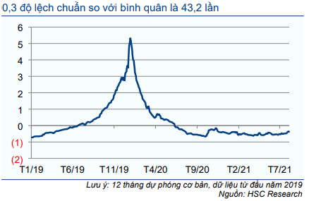 Hiện MSN có P/E dự phóng năm 2021 là 50,2 lần; năm 2022 là 28,4 lần và năm 2023 là 20.6 lần. P/E trượt dự phóng 1 năm là 34,5 lần; thấp hơn 20% (0,3 độ lệch chuẩn) so với bình quân P/E trượt dự phóng 1 năm trong quá khứ là 43,2 lần (tính kể từ đầu năm 2019).