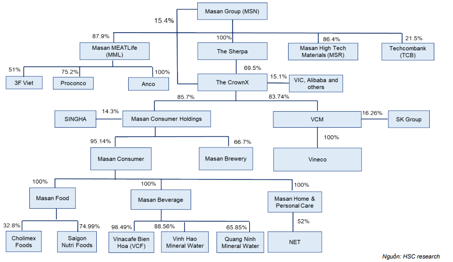 - Vì duy trì triển vọng tích cực đối với MCH và VCM, 2 pháp nhân thuộc The Crown X (TCX), nên HSC cho rằng định giá của thương vụ gần đây với Alibaba vẫn hợp lý. Định giá của TCX theo thương vụ là 7,27 tỷ USD, tương đương 168.727 tỷ đồng. HSC điều chỉnh tỷ lệ sở hữu tại TCX của MSN lên 84,9% từ 80,2%.