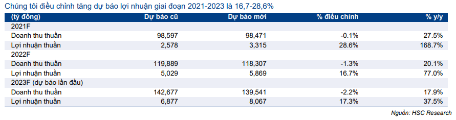 HSC lần lượt nâng 0,4%; 2,0% và 2,6% dự báo doanh thu thuần cho năm 2021, 2022 và 2023. HSC vẫn gần như giữ nguyên dự báo lợi nhuận thuần năm 2021 tại 3.950 tỷ đồng (tăng trưởng 15,9%). Dự báo lợi nhuận thuần cho năm 2022 là 4.544 tỷ đồng (tăng trưởng 15,3%) và năm 2023 là 4.840 tỷ đồng (tăng trưởng 6,5%).