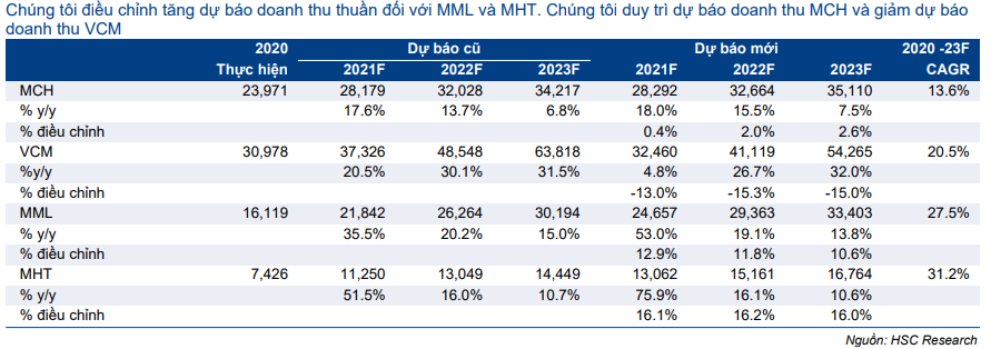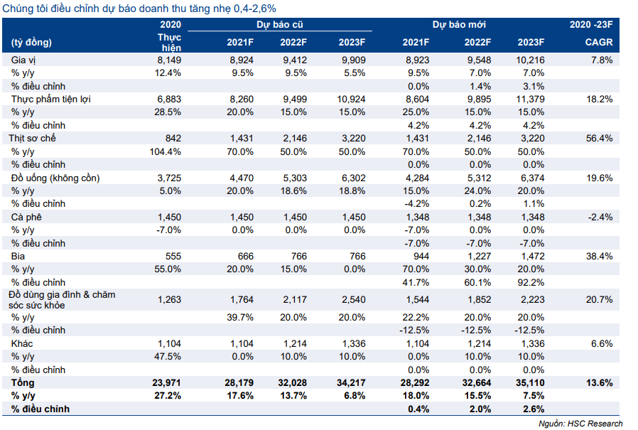 HSC nâng dự báo cho sản phẩm thực phẩm tiện lợi nhưng hạ giả định dự báo sản phẩm đồ uống. Đối với sản phẩm gia vị, HSC duy trì dự báo trước đây cho năm 2021 nhưng nâng dự báo doanh thu cho năm 2022 và 2023. Chúng tôi giả định người dân sẽ duy trì thói quen nấu ăn tại nhà sau dịch. Đối với sản phẩm thịt chế biến, HSC giữ nguyên dự báo trước đây.