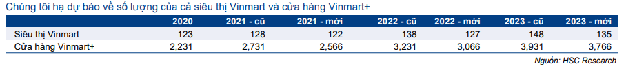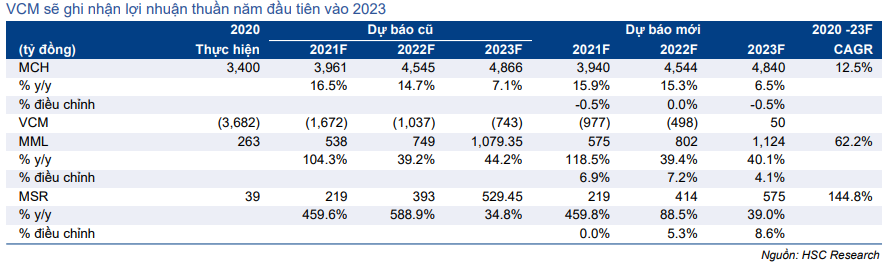 Theo đó, tỷ suất EBITDA sẽ cao hơn so với dự báo trước đây. HSC giảm giả định lỗ cho năm 2021 và 2022; và kỳ vọng Vincommerce sẽ có lãi thuần trong năm 2023 (thay vì lỗ thuần như trong dự báo trước đây). Chi tiết cụ thể như sau: