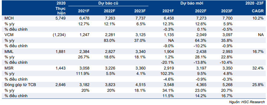 HSC trình bày tóm tắt dự báo cũ và mới cho năm 2021-2023 trong Bảng 2 dưới đây. Thông tin chi tiết cho từng mảng kinh doanh được trình bầy trong Bảng 3 và Bảng 4.