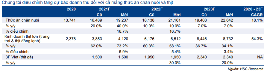 Về doanh thu, chúng tôi lần lượt nâng 12,9%; 11,8% và 10,6% dự báo lên 24.657 tỷ đồng (tăng trưởng 12,9%), 29.363 tỷ đồng (tăng trưởng 11,8%) và 33.403 tỷ đồng (tăng trưởng 13,8%); sau khi nâng dự báo cho mảng thức ăn chăn nuôi và thịt chế biến. Việc tỷ suất lợi nhuận giảm do giá đầu vào thức ăn chăn nuôi tăng sẽ phần nào được bù đắp nhờ giảm tỷ lệ chi phí bán hàng & quản lý/doanh thu.