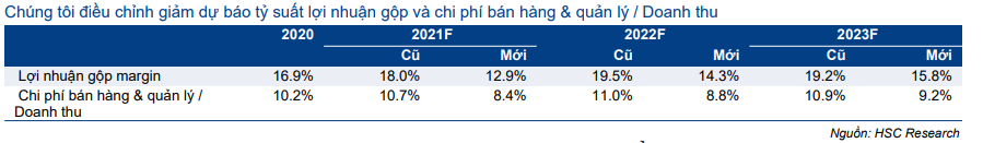 - Hạ 100 điểm cơ bản giả định tỷ suất lợi nhuận gộp trong năm 2021 và năm 2022 xuống còn lần lượt là 20% và 21,5%. HSC duy trì giả định tỷ suất lợi nhuận gộp cho năm 2023 ở mức 23%.