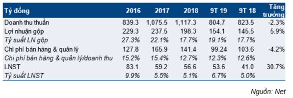 Trong 9 tháng đầu năm 2019, doanh thu thuần giảm nhẹ 2,3% so với cùng kỳ xuống còn 805 tỷ đồng nhưng lợi nhuận tăng 30.7% so với cùng kỳ lên 53,6 tỷ đồng nhờ tỷ suất lợi nhuận gộp tăng 1,4% lên 19,1%.