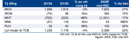 Mặc dù tăng mạnh so với cùng kỳ, lợi nhuận thuần Q1/2025 của MSN hoàn thành chỉ 13% dự báo cho cả năm 2025 của HSC, do chúng tôi kỳ vọng lợi nhuận của MCH và TCB tăng mạnh hơn.