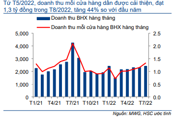 - Doanh thu/cửa hàng tăng 44% so với đầu năm. Doanh thu/cửa hàng/tháng trong tháng 7/2022 tăng lên 1,3 tỷ đồng, so với lần lượt 1,1 tỷ đồng, 1,2 tỷ đồng và 0,9 tỷ đồng trong tháng 5, tháng 6/2022 và tháng 12/2021. Tại các cửa hàng đã thay đổi layout từ 30 ngày trở lên, doanh thu đã tăng 8 – 10%, nhờ lưu lượng khách hàng và giá trị giỏ hàng của mỗi khách tăng lên. Việc đóng cửa các cửa hàng hoạt động kém hiệu quả cũng giúp doanh thu/cửa hàng cải thiện. BLĐ kỳ vọng doanh thu/cửa hàng sẽ đạt 1,5 tỷ đồng/tháng trong Q4/2022.