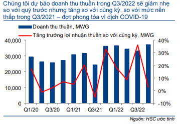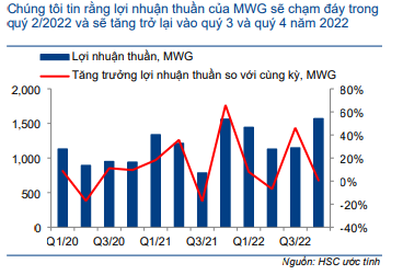 HSC cho rằng lợi nhuận của MWG đã chạm đáy trong Q2/2022. Theo đó, chúng tôi dự báo lợi nhuận thuần Q3/2022 sẽ tăng 2% so với quý trước và 47% so với cùng kỳ đạt 1.158 tỷ đồng nhờ KQKD của chuỗi BHX cải thiện. Trong Q4/2022, chúng tôi dự báo lợi nhuận thuần sẽ tiếp tục cải thiện 37% so với quý trước và 1% so với cùng kỳ đạt 1.582 tỷ đồng.