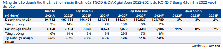 Trong năm 2024, HSC nâng đáng kể 11% dự báo lợi nhuận chuỗi TGDĐ & ĐMX. Theo đó, chúng tôi nâng 4% dự báo lợi nhuận của MWG lên 9.553 tỷ đồng (tăng trưởng 21%).