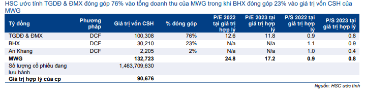 Mặc dù chúng tôi hạ dự báo lợi nhuận năm 2022, nhưng giá mục tiêu theo phương pháp DCF của chúng tôi gần như được giữ nguyên là 90.700đ/cp (tiềm năng tăng giá là 22%) sau khi chúng tôi chuyển giai đoạn cơ sở định giá sang cuối năm 2023. Tại giá mục tiêu mới của chúng tôi, P/E dự phóng 2023 là 17,2 lần. Với kỳ vọng lợi nhuận ngắn hạn phục hồi và triển vọng dài hạn vững chắc, HSC duy trì khuyến nghị Mua vào đối với MWG.