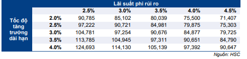 Bảng 18: Phân tích độ nhạy của giá mục tiêu đối với lãi suất phi rủi ro và tốc độ tăng trưởng dài hạn, MWG