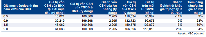 Ngoài ra, chúng tôi cũng cẩn trọng kiểm chứng giá trị của Cổ phiếu MWG theo nhiều kịch bản dựa trên phương pháp SoTP (Bảng 19). Trong các kịch bản này, HSC áp dụng nhiều bội số P/S mục tiêu 2023 đối với BHX, dao động trong khoảng từ 0,5-2,0 lần, để xác định giá trị vốn CSH của BHX và sau đó là của MWG. Theo đó, MWG sẽ có định giá dao động trong khoảng 80.082đ (thấp hơn 11% so với giá trị hợp lý của chúng tôi là 90.700đ) đến 113.818đcp (cao hơn 25% so với giá trị hợp lý của chúng tôi là 90.700đ).