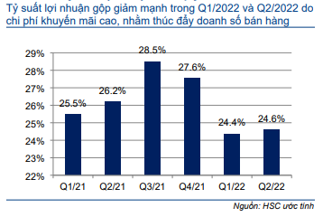 (1) Tỷ suất lợi nhuận gộp sụt giảm do các chương trình khuyến mại. MWG đã chấp nhận hy sinh tỷ suất lợi nhuận để thúc đẩy doanh thu. Để thúc đẩy lưu lượng khách hàng, BHX đã thực hiện một chiến dịch khuyến mãi lớn, khiến tỷ suất lợi nhuận gộp giảm xuống 24,4-24,6% trong Q1 và Q2/2022 (so với mức bình quân là 27,1% trong năm 2021). Trong cả năm 2022, HSC kỳ vọng tỷ suất lợi nhuận gộp sẽ ở mức 24,8%, thấp hơn so với dự báo trước đó của chúng tôi là 27,0%.
