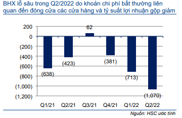 (1) Lỗ thuần trong năm 2022 sẽ rất lớn. Chúng tôi dự báo lỗ thuần của BHX trong năm 2022 sẽ là 2.549 tỷ đồng, lớn hơn nhiều so với dự báo trước đó của chúng tôi là 776 tỷ đồng do khoản chi phí không thường xuyên lớn và tỷ suất lợi nhuận gộp giảm.