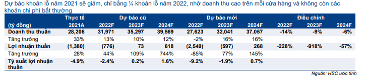 (2) Chi phí không thường xuyên lớn trong năm 2022. Việc đóng cửa vĩnh viễn 400 cửa hàng BHX đã khiến chi phí không thường xuyên cao đáng kể. HSC ước tính chi phí này trong 6 tháng đầu năm, 6 tháng cuối năm và cả năm 2022 sẽ lần lượt là 807 tỷ đồng, 482 tỷ đồng và 1.289 tỷ đồng. Khoản chi phí này không bao gồm trong mô hình dự báo trước đây của chúng tôi.