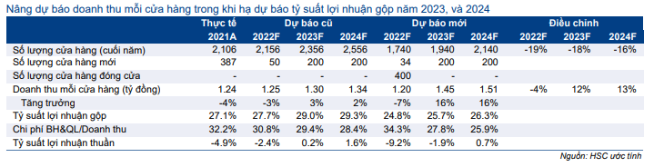 Trong kịch bản cơ sở mới, HSC giả định doanh thu/cửa hàng/tháng sẽ tiếp tục tăng trưởng 16% đạt 1,45 tỷ đồng, tỷ suất lợi nhuận gộp sẽ cải thiện lên 25,7% (từ 24,8% trong năm 2022, nhưng vẫn thấp hơn nhiều so với dự báo trước đó của chúng tôi là 29,0%), chủ yếu do tính quy mô kinh tế và 200 cửa hàng sẽ được mở mới trong năm 2023. Theo đó, chúng tôi dự báo doanh thu thuần của BHX sẽ đạt 32.041 tỷ đồng (tăng trưởng 16,0%) và lỗ thuần sẽ giảm xuống 597 tỷ đồng.