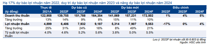 Do HSC nâng dự báo lợi nhuận chuỗi TGDĐ & ĐMX và hạ dự báo lợi nhuận chuỗi BHX, dự báo lợi nhuận thuần cả năm 2023 của chúng tôi gần như không thay đổi là 7.907 tỷ đồng, tăng trưởng 49% so với mức nền thấp trong năm 2022, do BHX giảm lỗ và lợi nhuận của TGDĐ & ĐMX tăng trưởng 1 con số. Nếu không bao gồm khoản lỗ bất thường trong năm 2022, lợi nhuận cốt lõi được dự báo sẽ tăng trưởng 20% trong năm 2023.