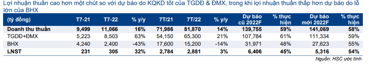 Trong 7 tháng đầu năm 2022, doanh thu thuần của MWG đạt 81.870 tỷ đồng, tăng 14% so với cùng kỳ (Bảng 8), đạt 59% dự báo cả năm trước đó của chúng tôi và cao hơn một chút so với dự báo của chúng tôi do KQKD của chuỗi TGDĐ & ĐMX vượt kỳ vọng. Trong khi đó, lợi nhuận thuần trong kỳ đạt 2.881 tỷ đồng, tăng 3% so với cùng kỳ, chỉ đạt 45% dự báo cả năm 2022 của chúng tôi do khoản lỗ lớn đáng thất vọng tại BHX.