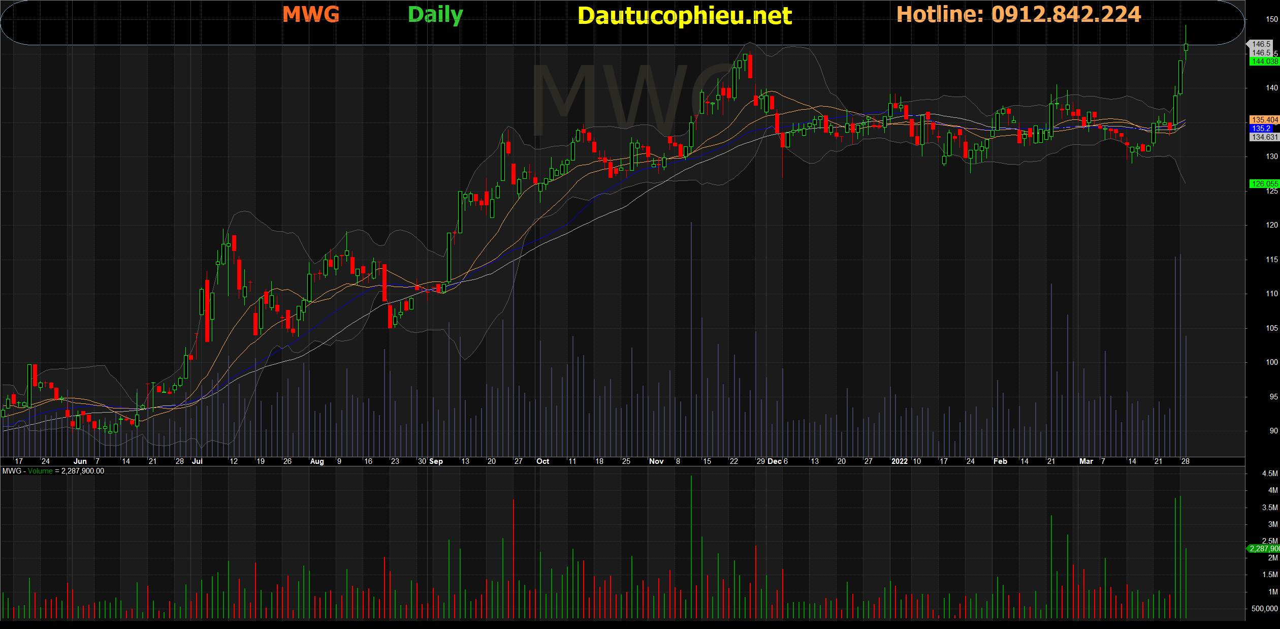 Đồ thị cổ phiếu MWG phiên giao dịch ngày 29/03/2022. Nguồn: AmiBroker