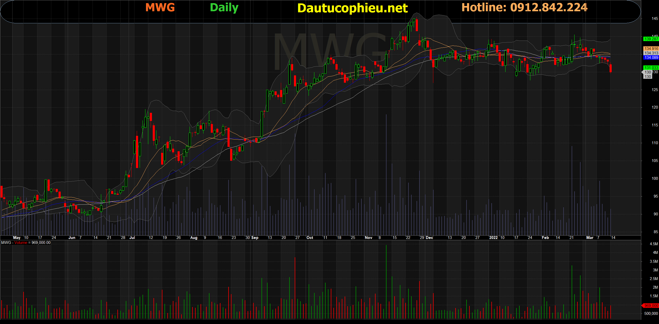 Đồ thị cổ phiếu MWG phiên giao dịch ngày 14/03/2022. Nguồn: AmiBroker