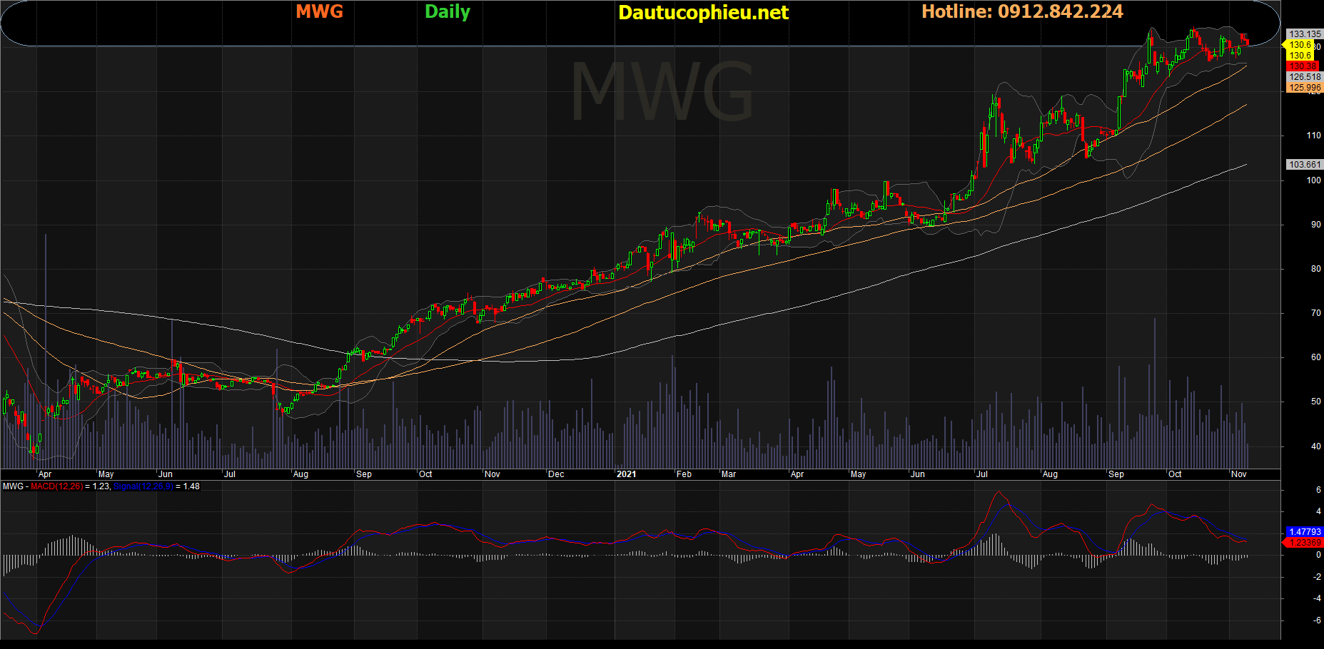 Đồ thị cổ phiếu MWG phiên giao dịch ngày 09/11/2021. Nguồn: AmiBroker